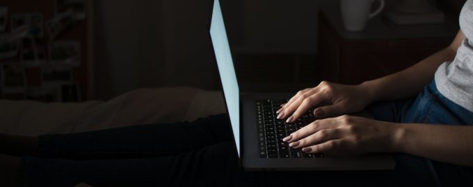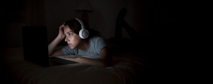 Im Winter sitzen viele Menschen abends an ihrem Laptop oder Telefon, wenn fast kein Licht im Raum ist. Rundherum ist es dunkel, nur der helle Bildschirm befindet sich.